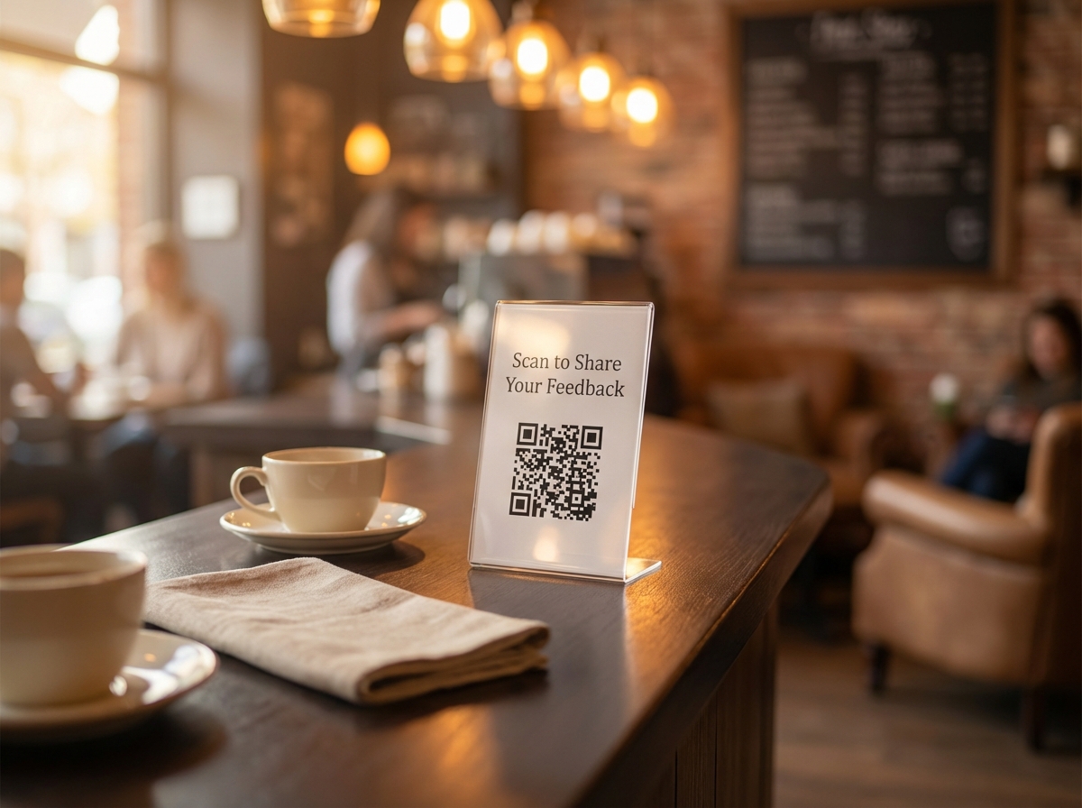 A coffee shop places QR tent cards on every table. Customers scan to share their experience through a quick survey — no app needed.